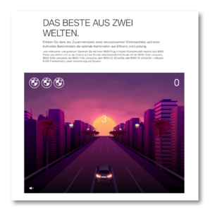 BMW verknüpft bei dem Thema Unterhaltung zwei Content-Arten: Gewinnspiele und Gaming. Bei einem Racing-Simulator können Nutzer*innen Punkte sammeln und ein viermonatiges Fahrvergnügen mit einem Plug-in-Hybrid Modell des Autoherstellers gewinnen.