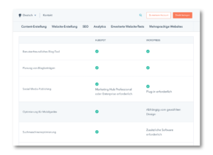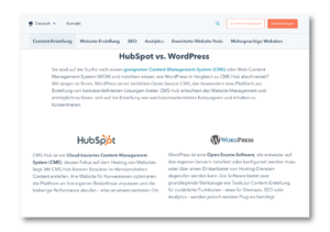 Im Tabellenformat vergleicht sich HubSpot mit dem CMS WordPress und kommuniziert diesen Mehrwert schon in der Überschrift klar und auf dem Punkt gebracht: „HubSpot vs. WordPress“. So überzeugt HubSpot mit Selbstbewusstsein, welches mit Fakten untermauert wird – und kann damit die eigene Zielgruppe optimal ansprechen.