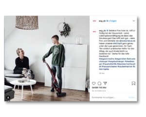 Der Haushaltsgerätekonzern Electrolux setzt bei seiner AEG Marke häufiger auf die Hilfe deutscher Influencer*innen. Auf Instagram wirbt die deutsche „Greenfluencerin“ Michelle alias „lovelynature.de“ mit ihrem Sohn für diverse Produkte des Unternehmens.