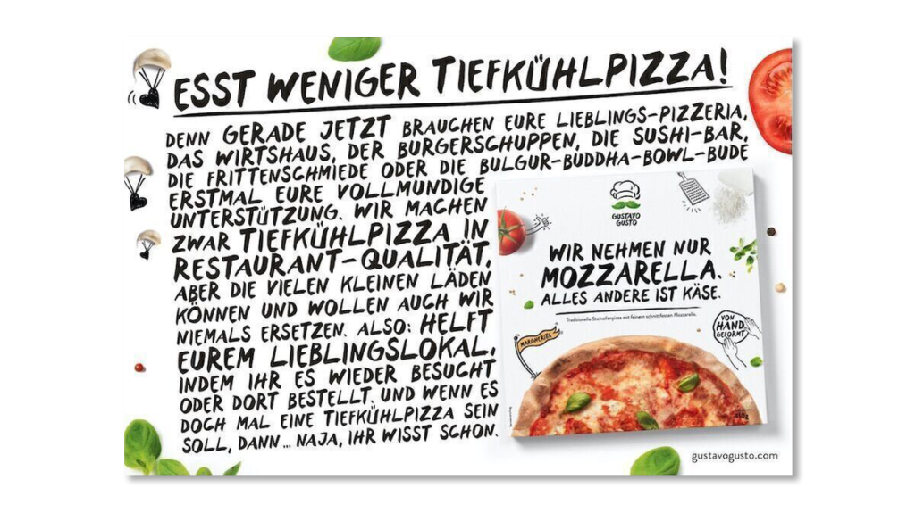 „Esst weniger Tiefkühlpizza!“, steht in großen Lettern auf dem Werbeplakat von Gustavo Gusto. Die Aufforderung des Tiefkühlpizza-Herstellers aus Passau erinnert an Patagonias Kampagne – nur der Beweggrund ist ein anderer.