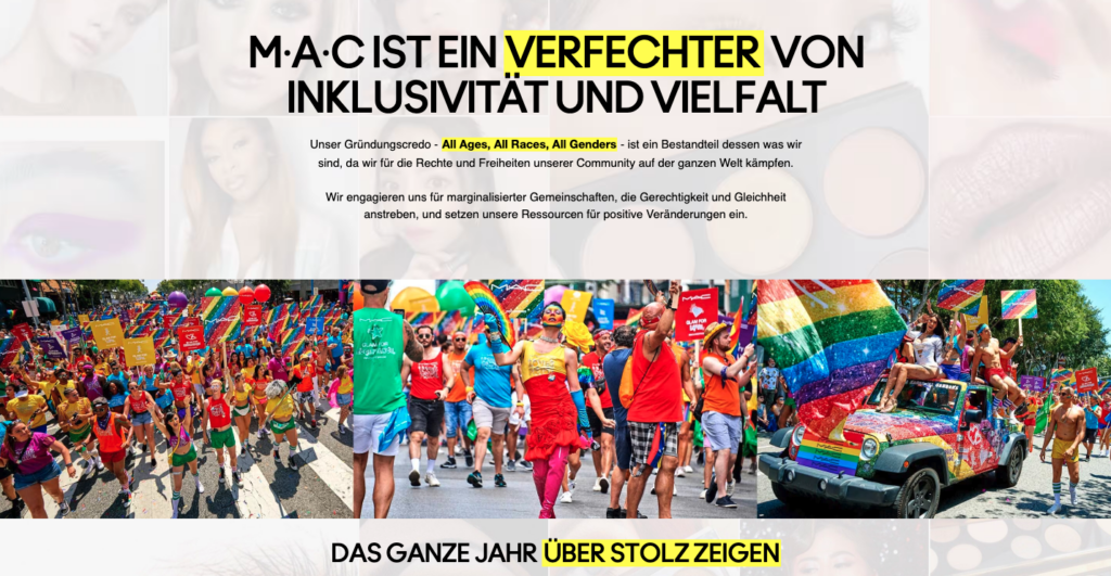 Der US-amerikanische Kosmetikhersteller MAC zeigt bereits im Claim, worauf es ankommt: „All Ages. All Races. All Genders“, was so viel bedeutet wie „Alle Altersklassen. Alle Menschen. Alle Geschlechter.“ Selbst schreibt das Unternehmen auf seiner Website: „Wir engagieren uns für marginalisierter Gemeinschaften, die Gerechtigkeit und Gleichheit anstreben, und setzen unsere Ressourcen für positive Veränderungen ein.“