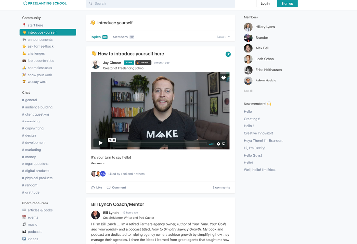 Im Beispiel siehst du die individuell angepasste Circle-Seite der Freelancing School. Dort kannst du Elemente aus Plattformen wie Slack, Facebook, YouTube etc. erkennen.
