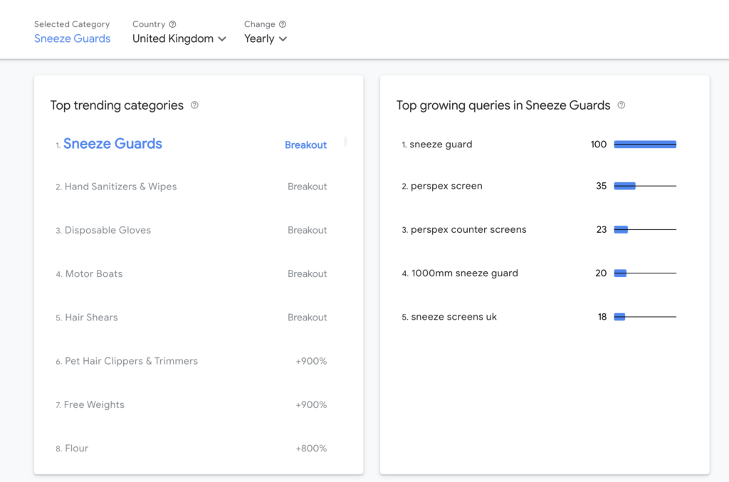 Interessierte finden das Feature auf Think with Google. Sie können die Kategorien sowie ihr Wachstum pro Woche, Monat und Jahr einsehen – zusätzlich erhalten sie Informationen darüber, welche Suchanfragen in den jeweiligen Kategorien trenden und wie das Interesse auf die jeweiligen Staaten bzw. Bundesländer aufgeteilt ist. Auch hat Google angedeutet, dass tägliche Veränderungen ebenfalls einsehbar werden sollen.